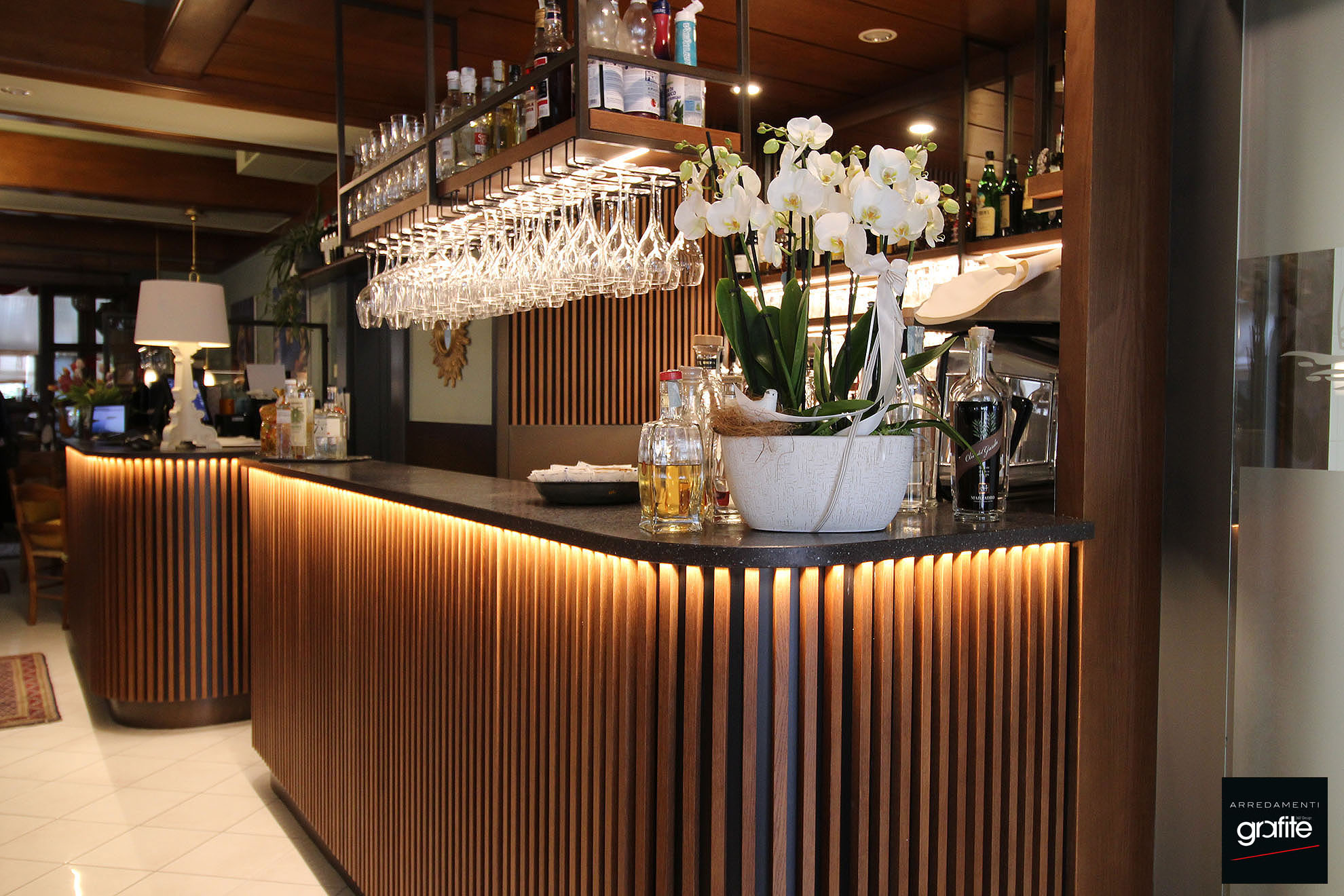 Per il ristorante-grill di Torbole, Trento, GM Arredamenti ha realizzato su disegno di Arredamenti Grafite un raffinato bancone bar curvo, pensato per combinare eleganza e funzionalità. La decorazione a listelli verticali in legno su fondo nero, valorizzata da illuminazione LED, dona al locale un’atmosfera calda e ricercata. Lo stile moderno ed essenziale prosegue nella struttura in metallo del portabottiglie sospeso, che riprende le stesse finiture del bancone, unendo estetica e praticità in un unico elemento d’arredo.