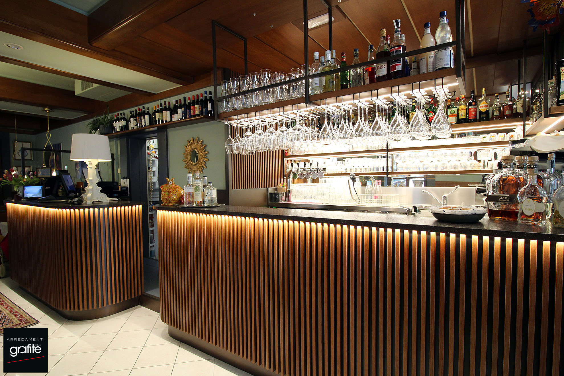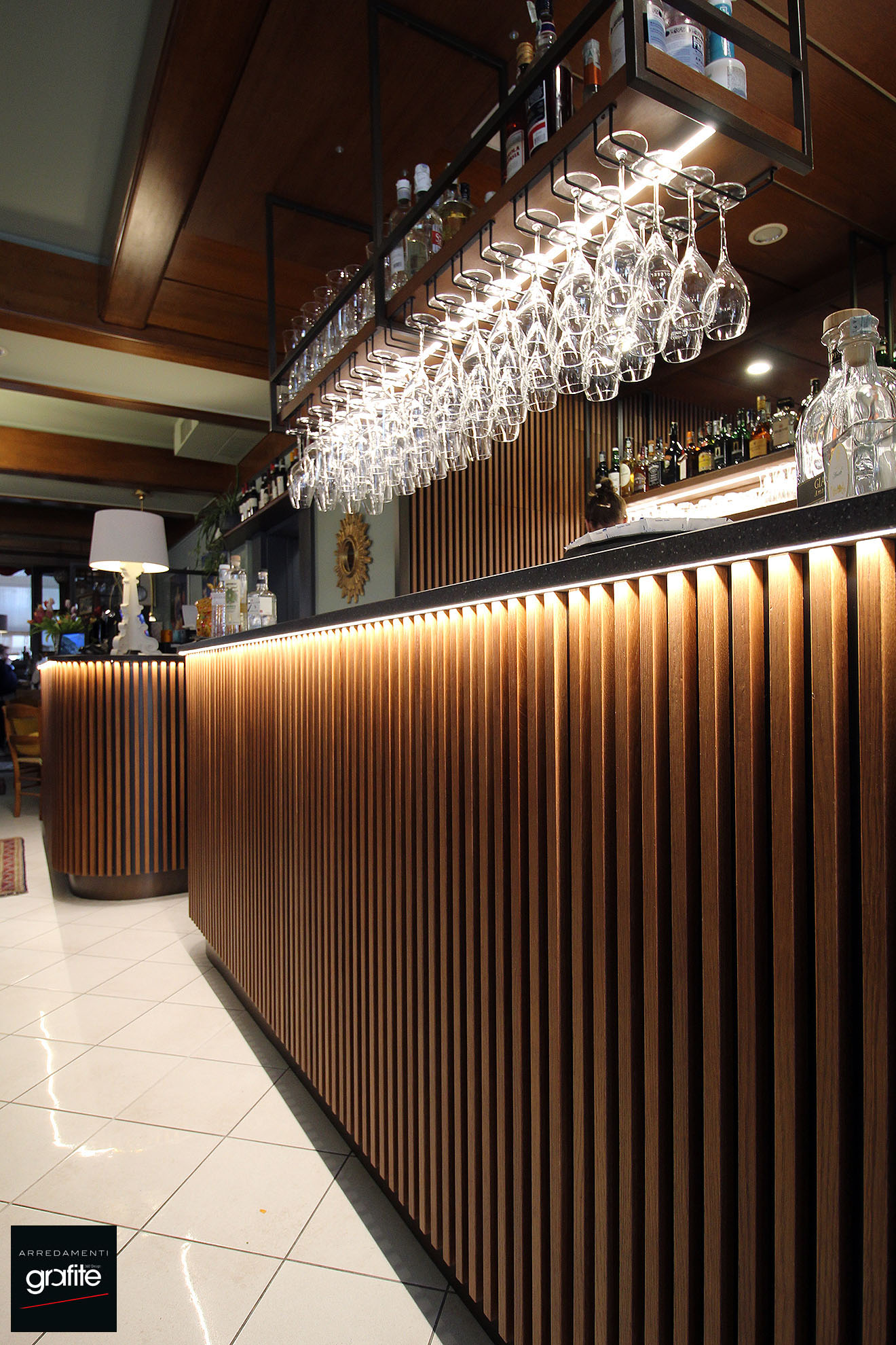 Il bancone curvo del bar è caratterizzato da una decorazione a listelli verticali in legno su fondo nero, che, grazie all’illuminazione LED, dona al locale un’atmosfera elegante e ricercata. Realizzato da GM Arredamenti su progetto di Arredamenti Grafite.