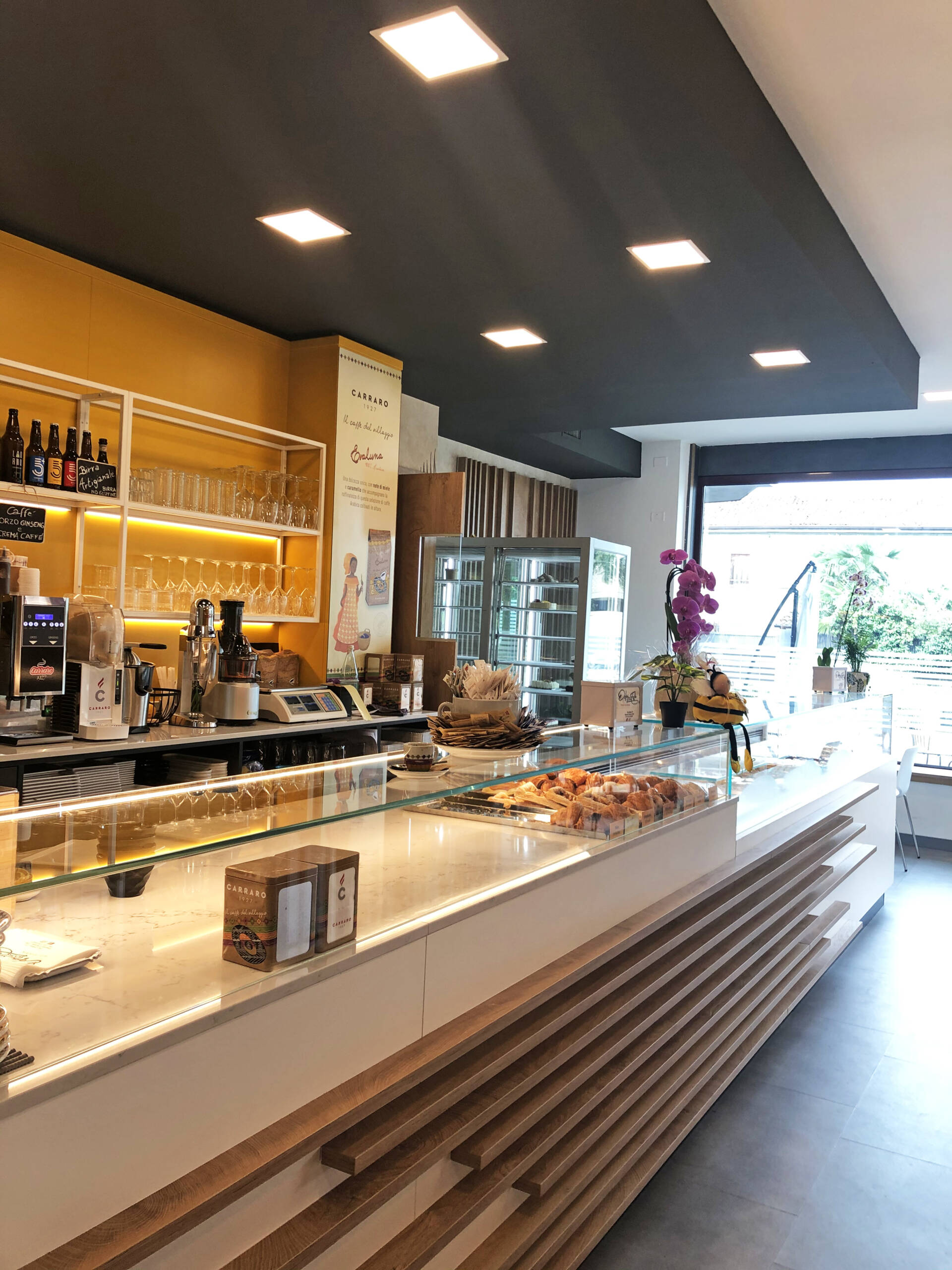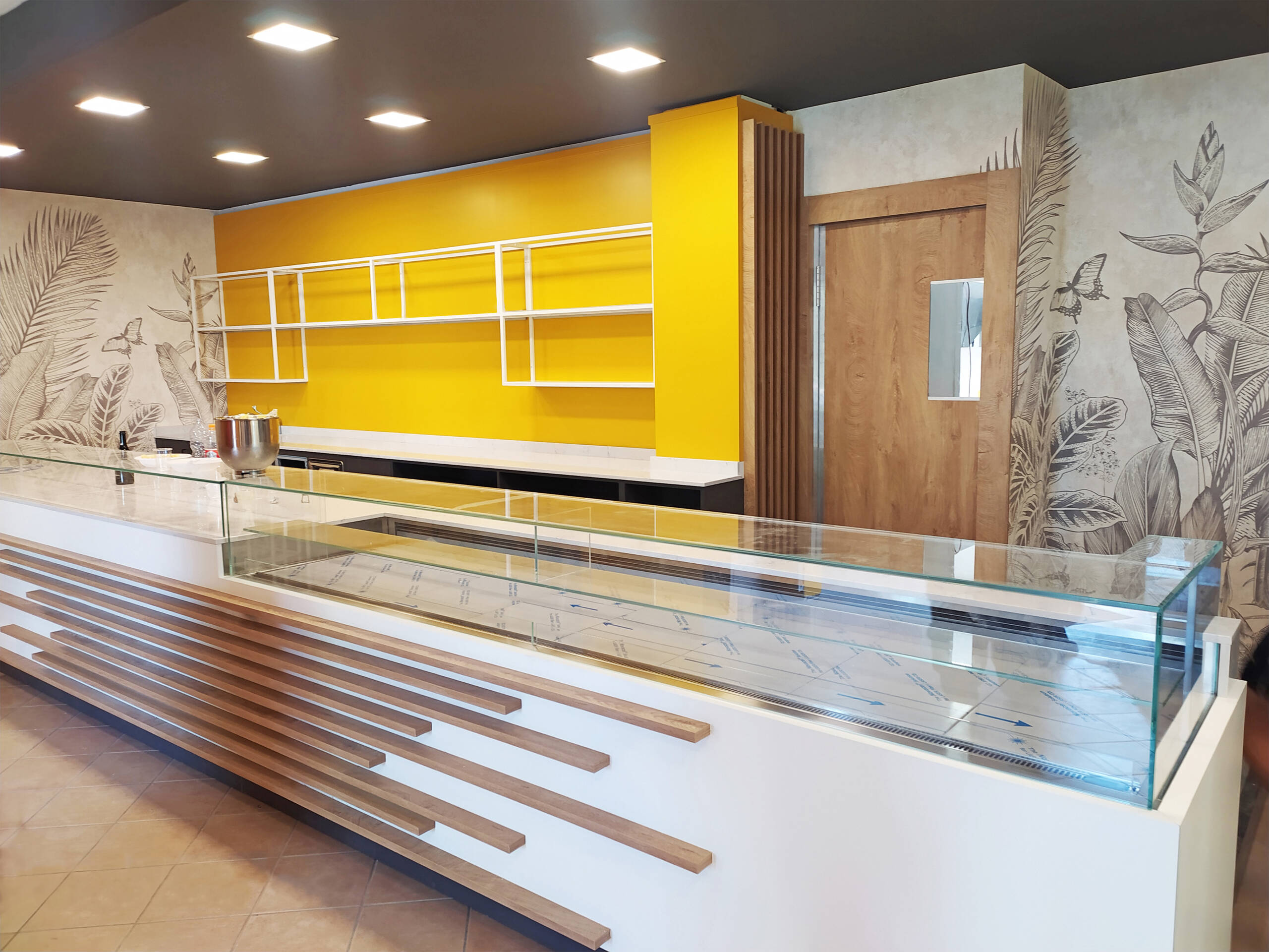L’arredamento su misura del bar pasticceria di Gazzolo, realizzato in stile contemporaneo ed elegante, combina materiali e colori studiati per creare un ambiente accogliente e raffinato. Il bianco candido, il legno naturale e le tonalità di grigio donano armonia e modernità, mentre l’accento giallo caldo e solare aggiunge un tocco di vitalità e allegria.