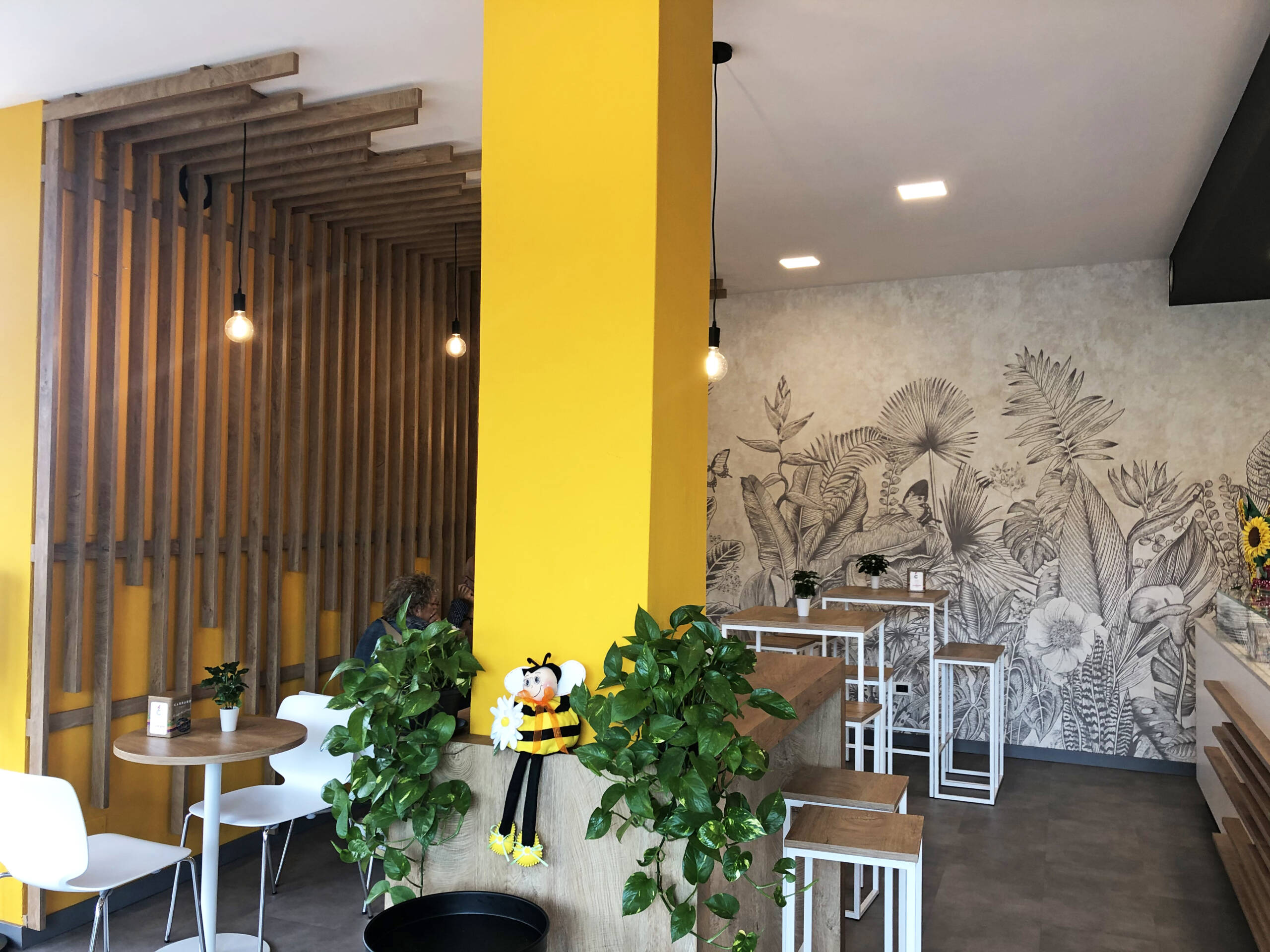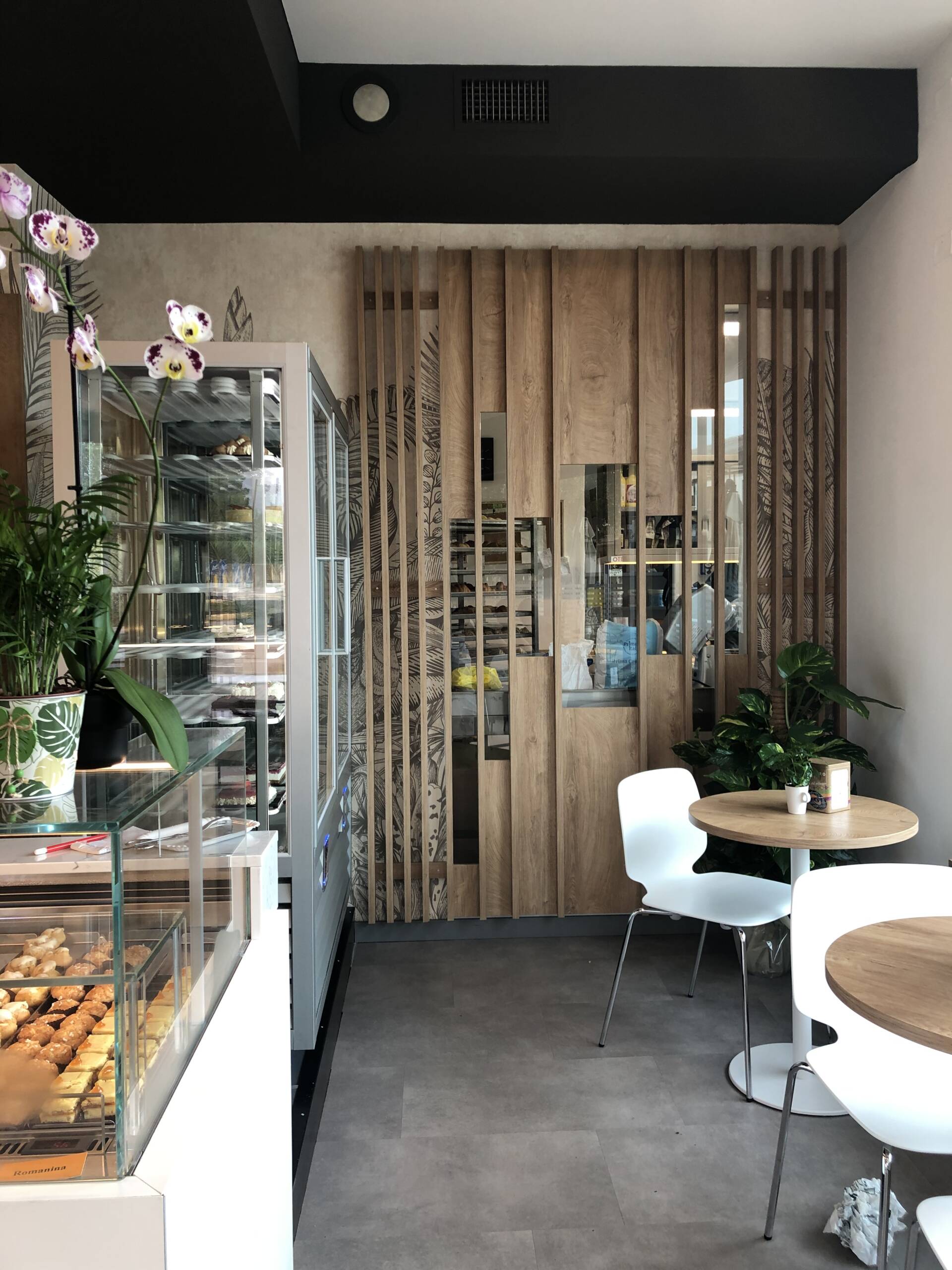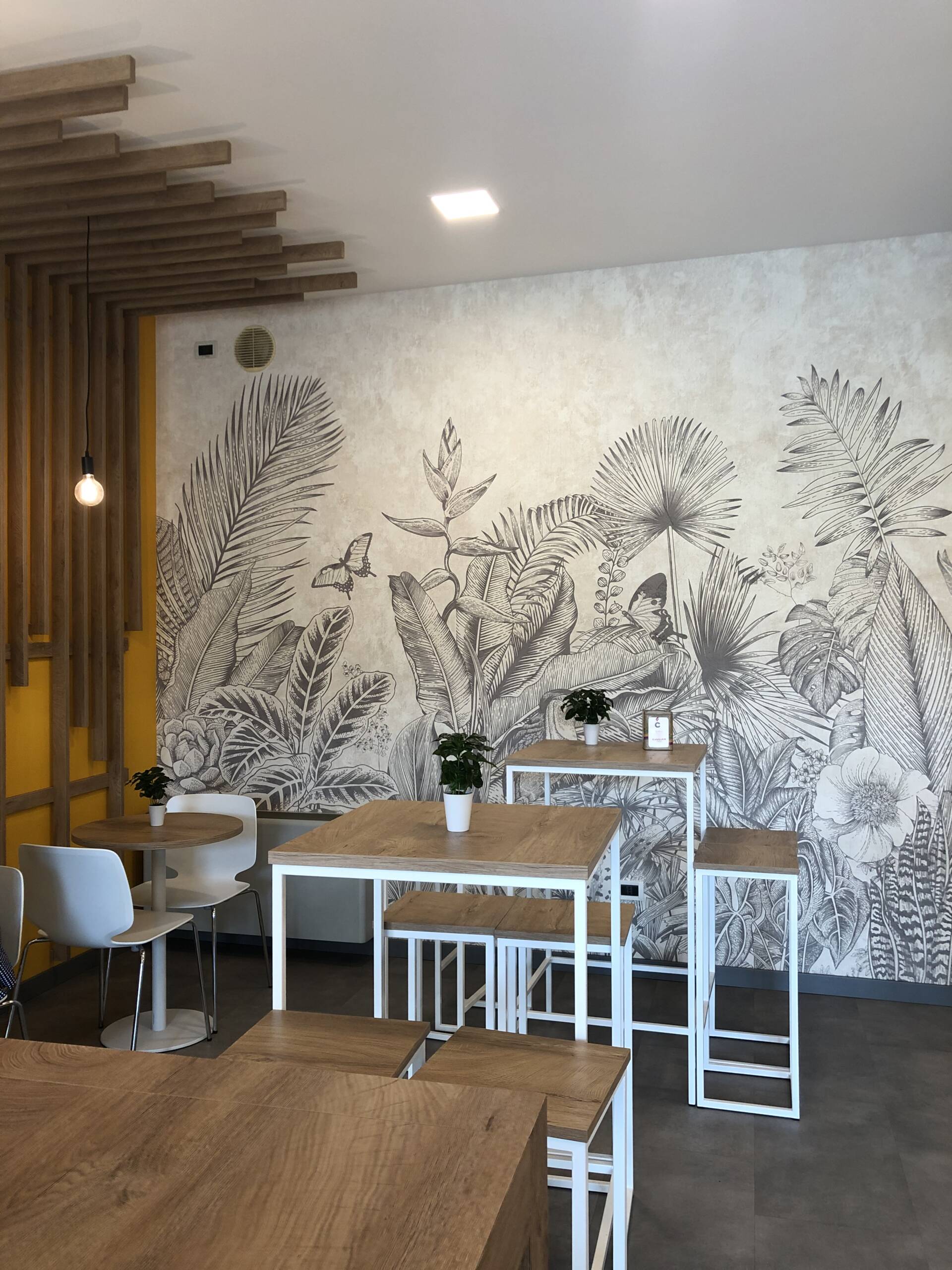 Il bancone bianco, simbolo di pulizia ed eleganza, è decorato con listelli di legno disposti in un design originale che accompagna lo sguardo attraverso lo spazio, creando un gioco di profondità e movimento. La scenografica carta da parati, con motivi di foglie e farfalle, trasforma il locale in un vero giardino urbano, dove la natura sembra prendere vita, regalando un’atmosfera unica e suggestiva.