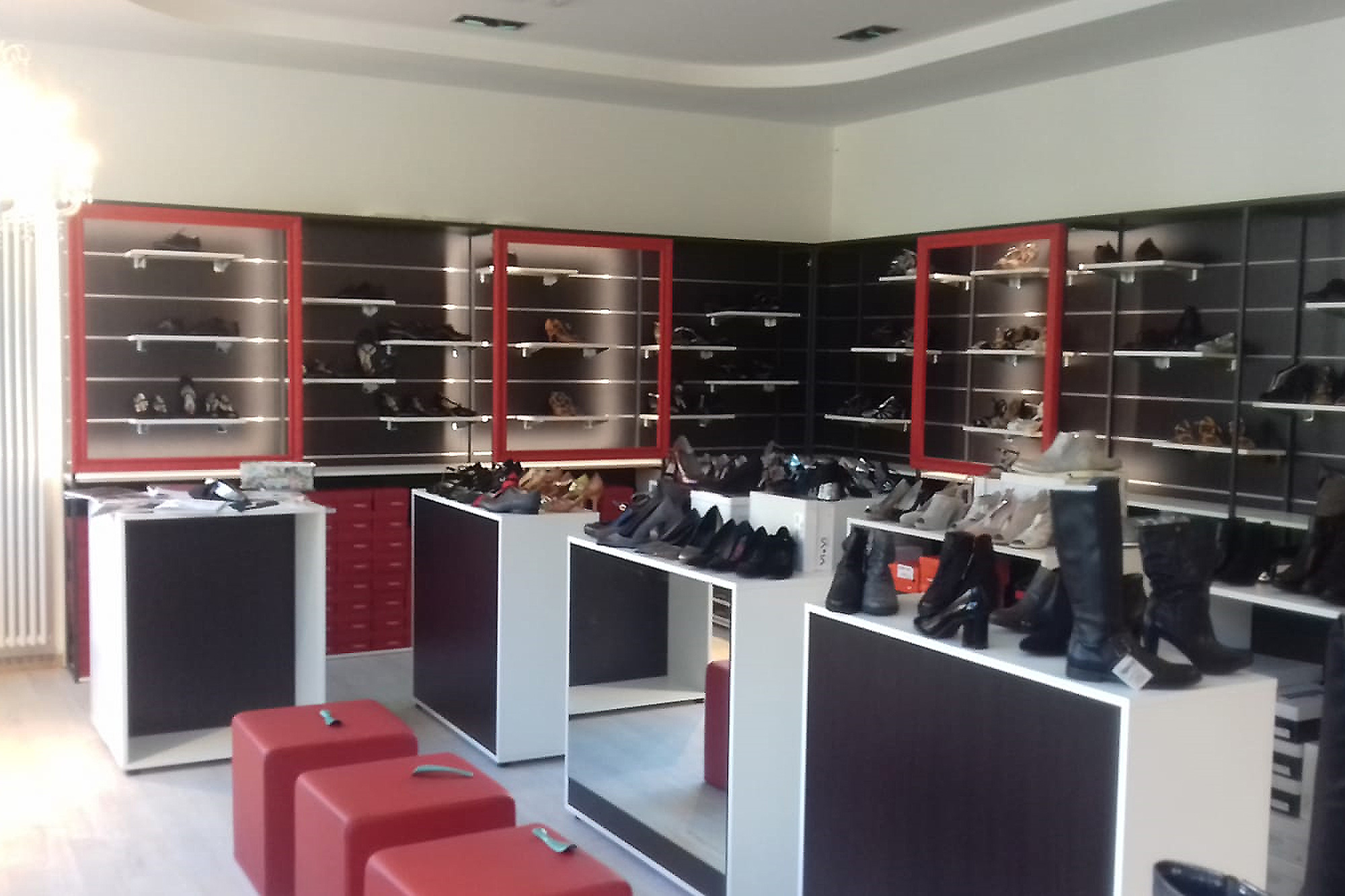 Progettazione e realizzazione arredo per il negozio di calzature Donna Chic a Verona da parte di GM Arredamenti. Soluzione contemporanea con contrasto bianco-nero, cornici rosse e faretti a LED.