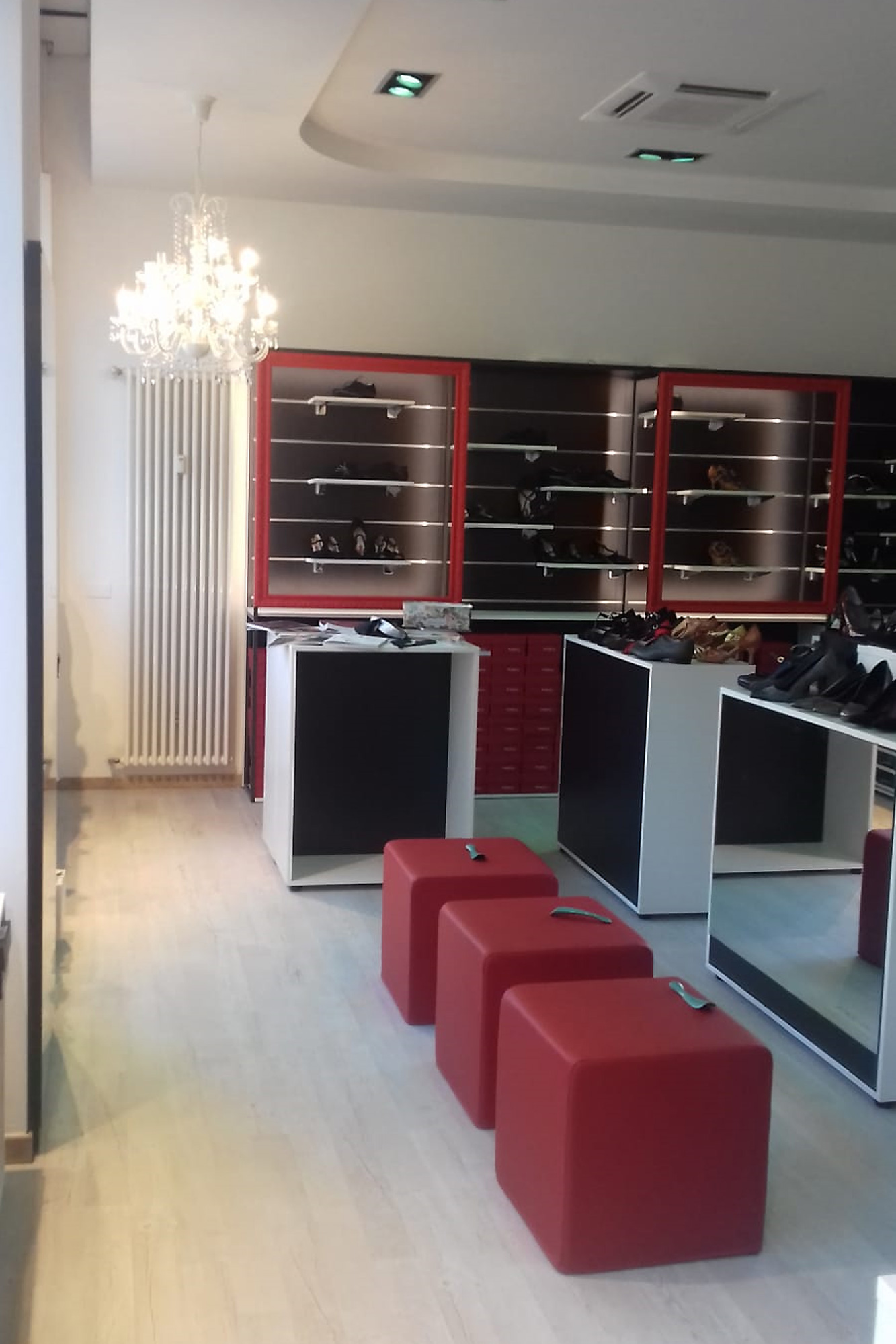 L’arredamento è completato da comode poltroncine di pelle rossa, che offrono ai clienti un luogo confortevole dove provare le calzature.