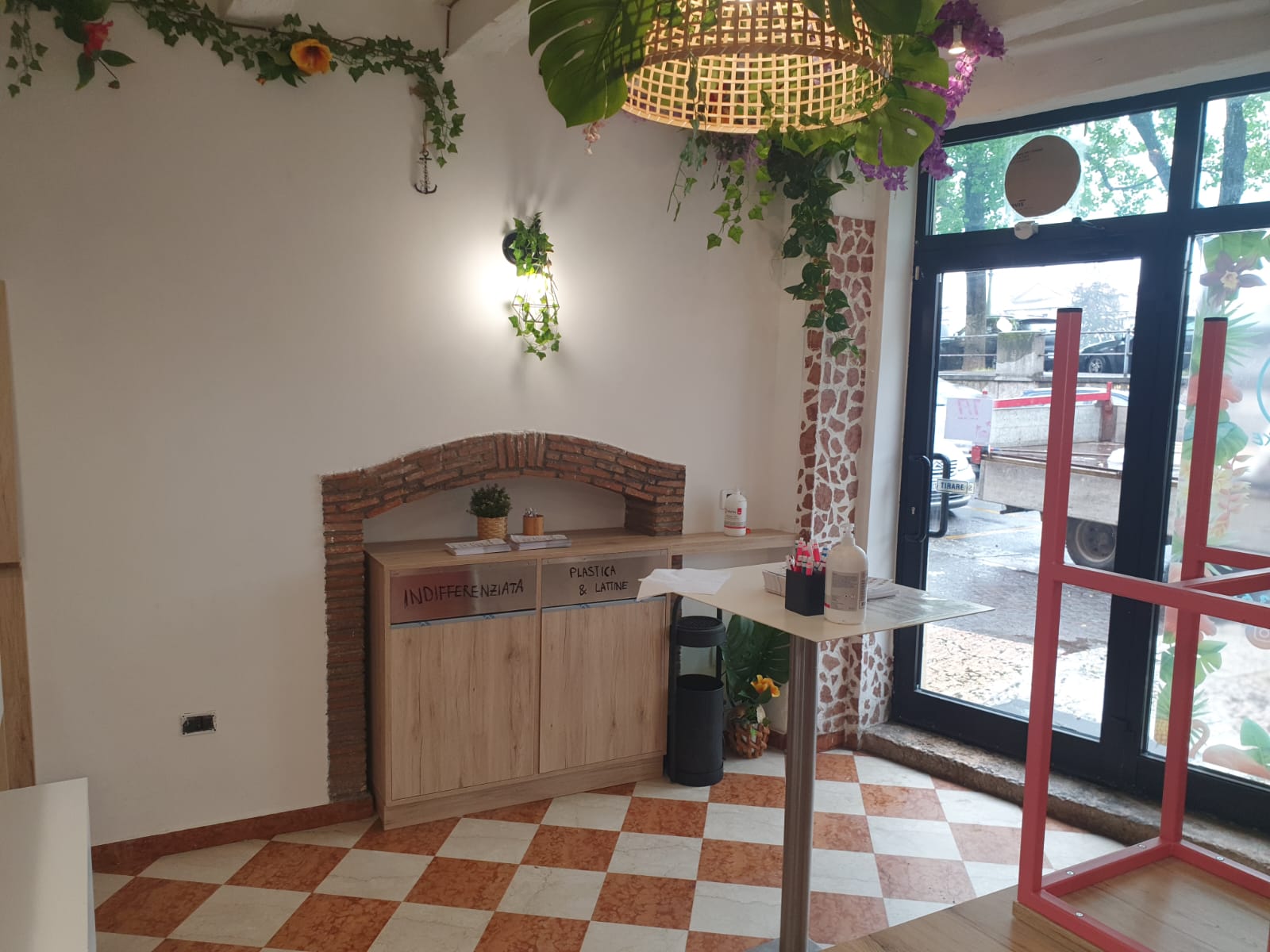 Il pezzo forte dell’arredamento è il bancone in legno chiaro, dove i clienti possono ammirare i prodotti freschi e comporre la propria bowl. Lo stesso legno chiaro è utilizzato per i ripiani dei tavolini, che poggiano su strutture in ferro battuto dipinte con tonalità pastello, aggiungendo un tocco di eleganza e modernità.