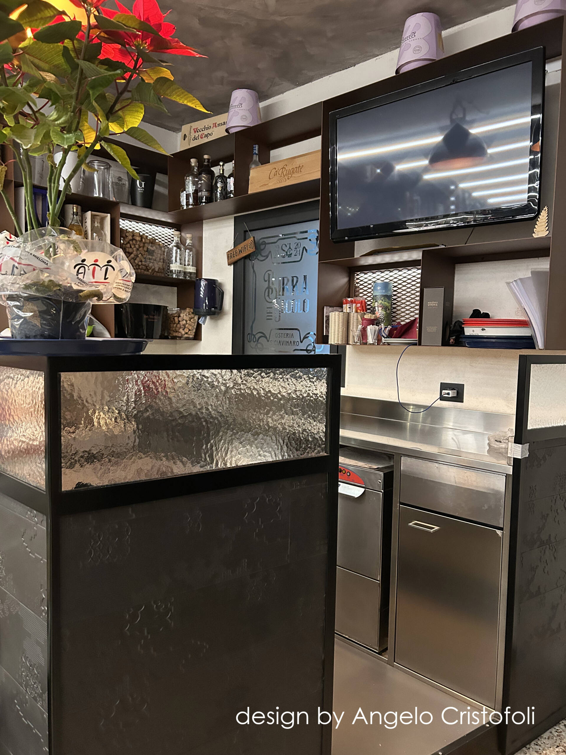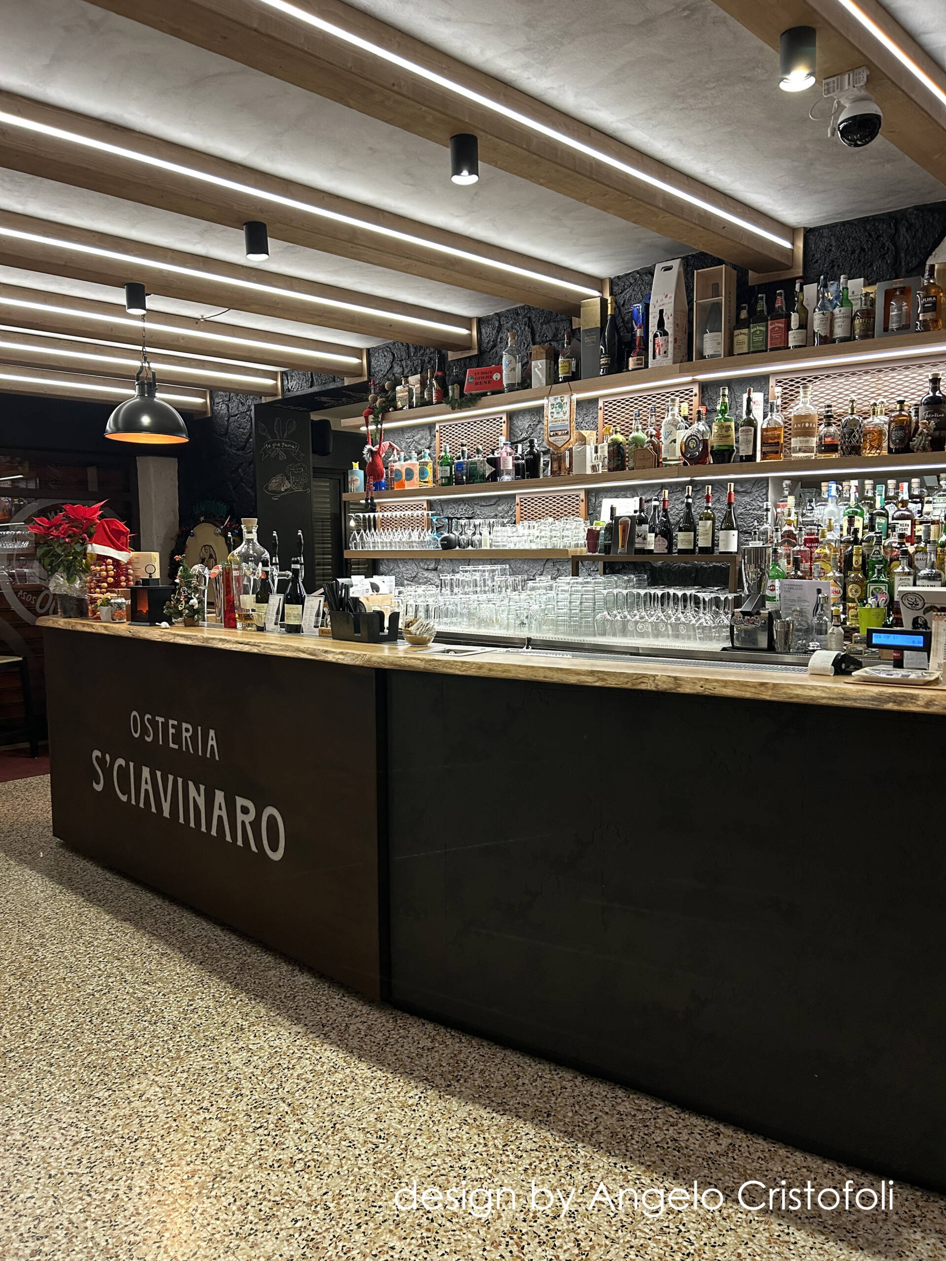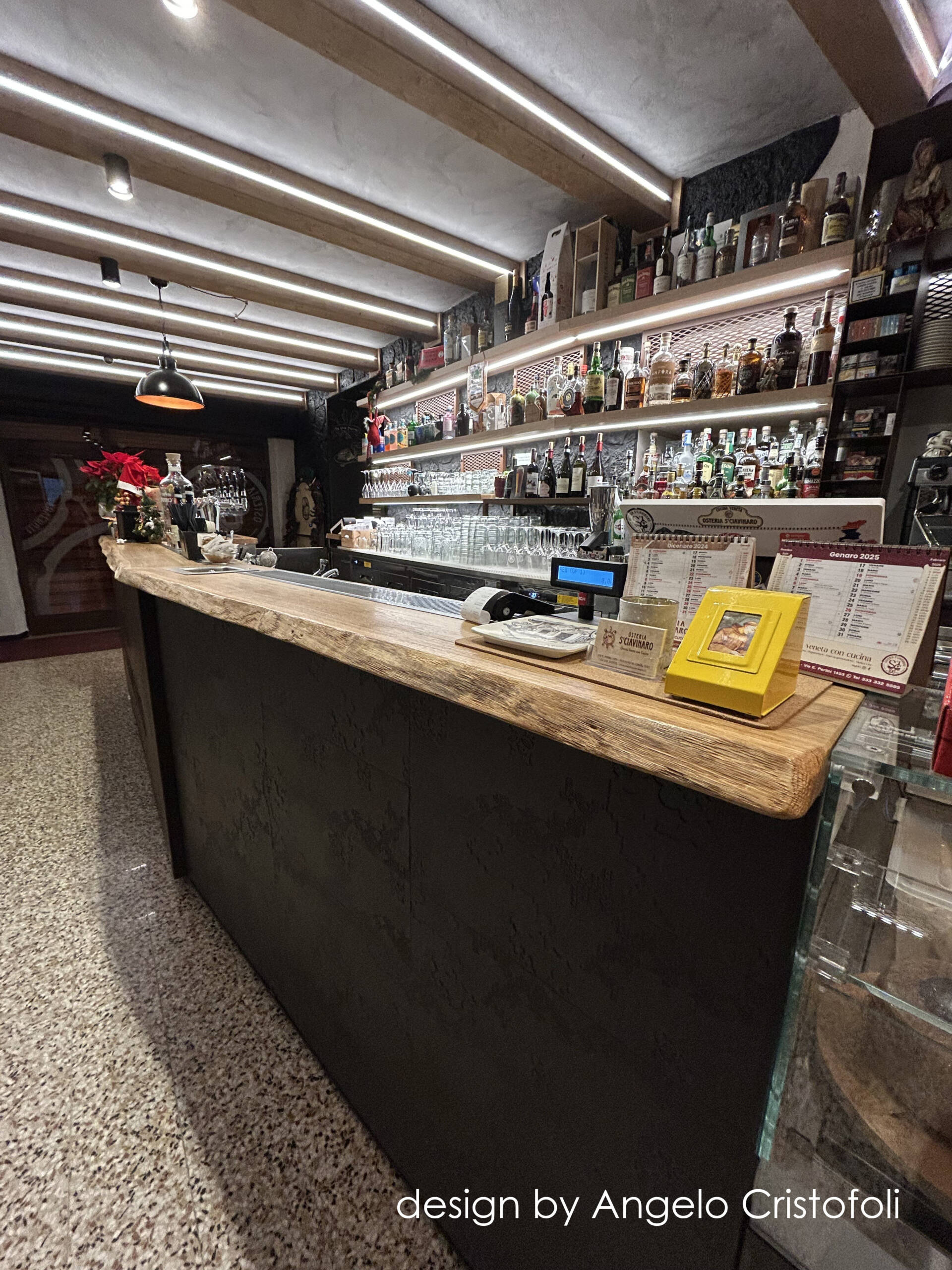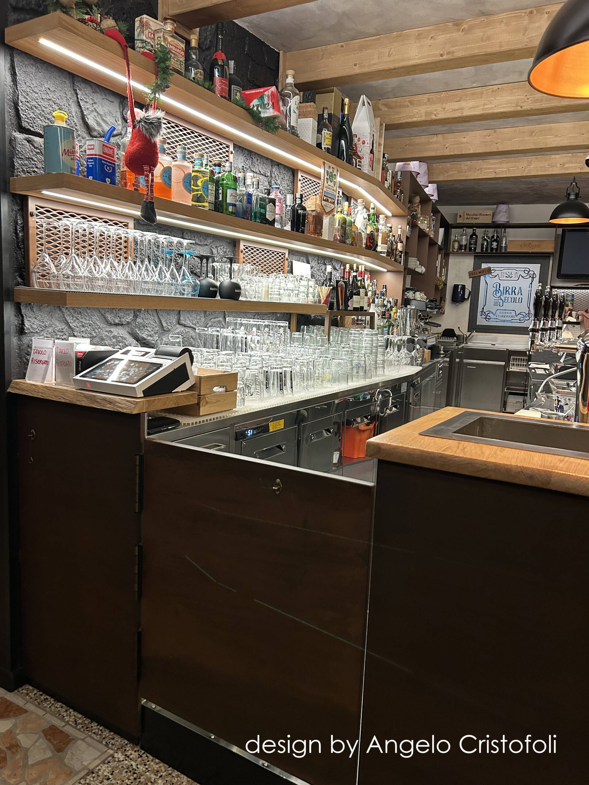 Il nuovo arredamento del locale/osteria è stato progettato in collaborazione con Angelo Cristofoli, con particolare attenzione ai dettagli e alla funzionalità. Il banco bar è caratterizzato da un design innovativo, con una metà del fronte rivestita in metallo finitura Corten con logo traforato e retroilluminato, e l’altra metà con piastrelle artigianali dal design ricercato e bassorilievo geometrico.