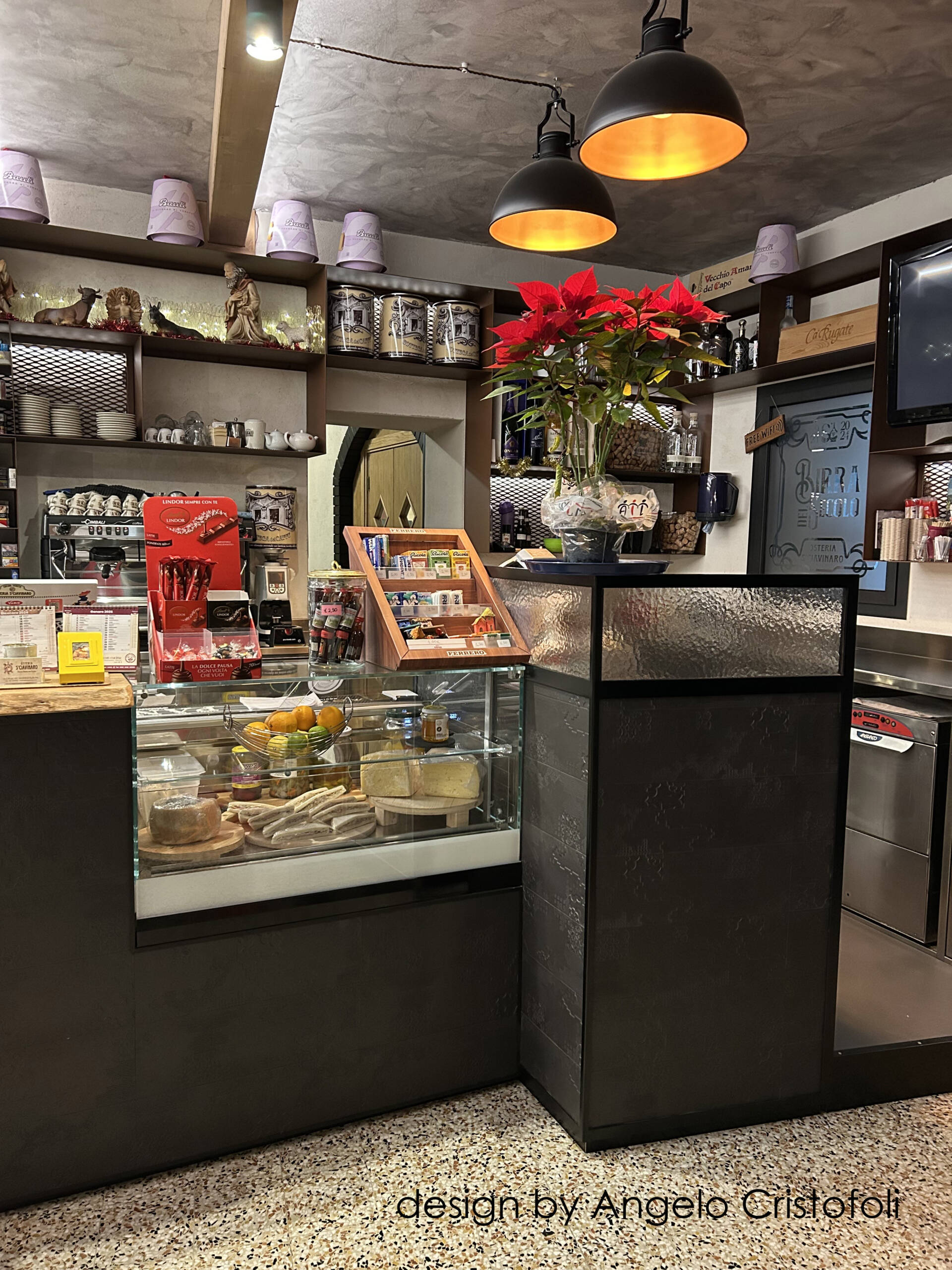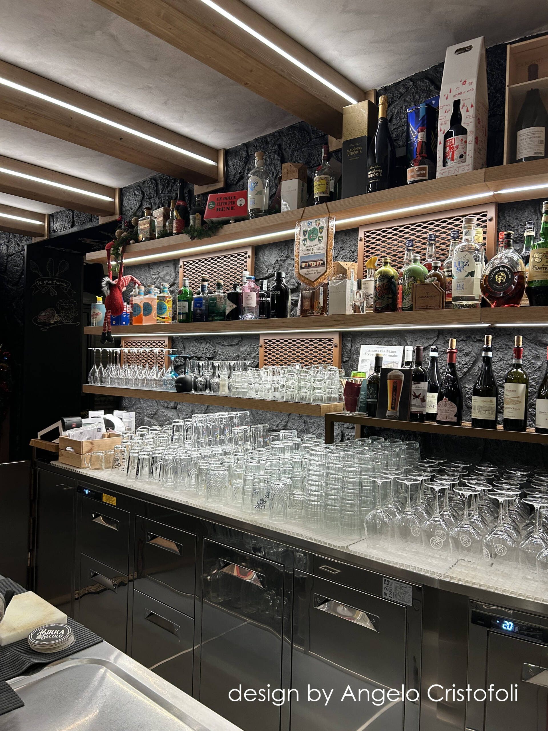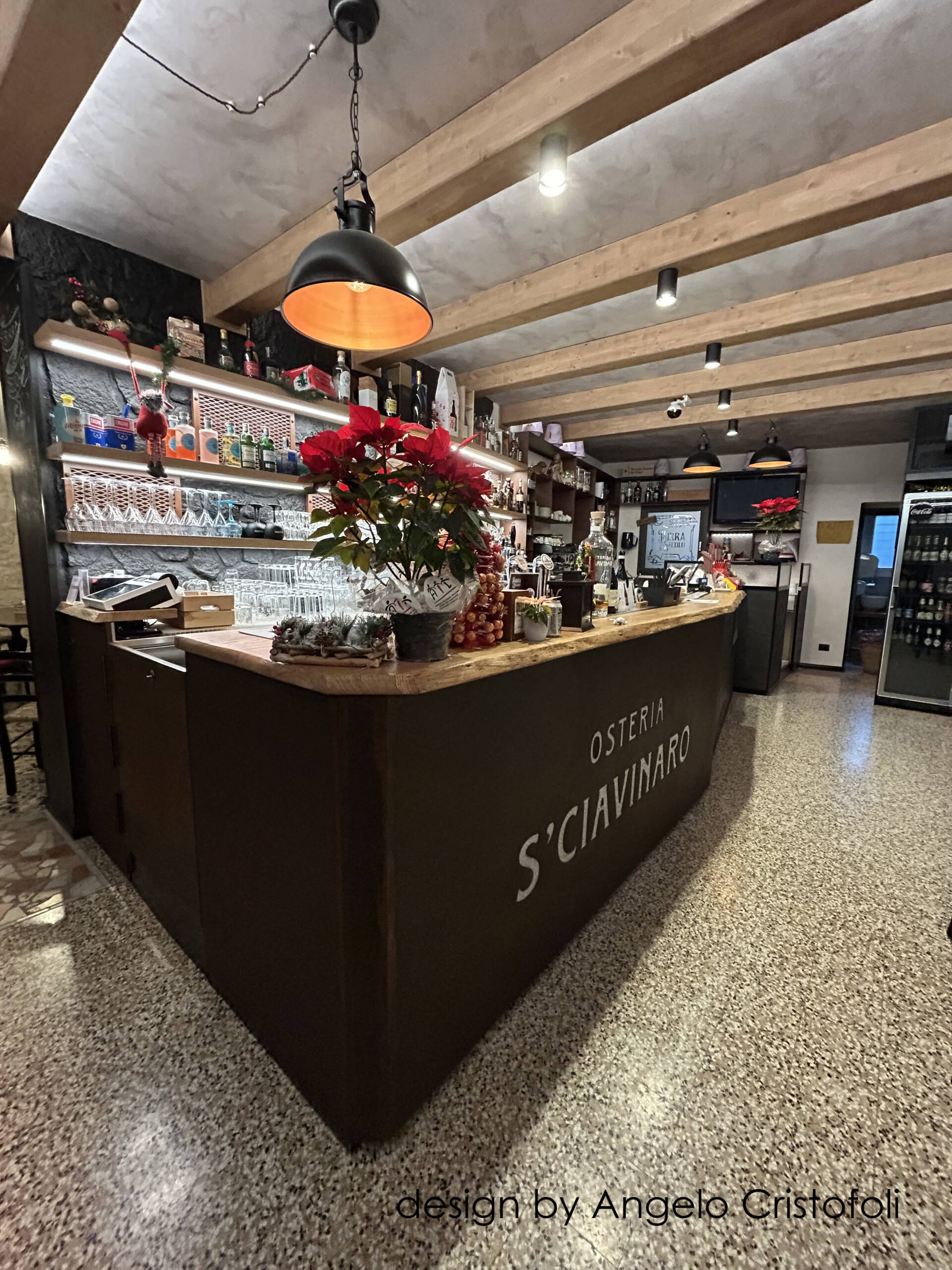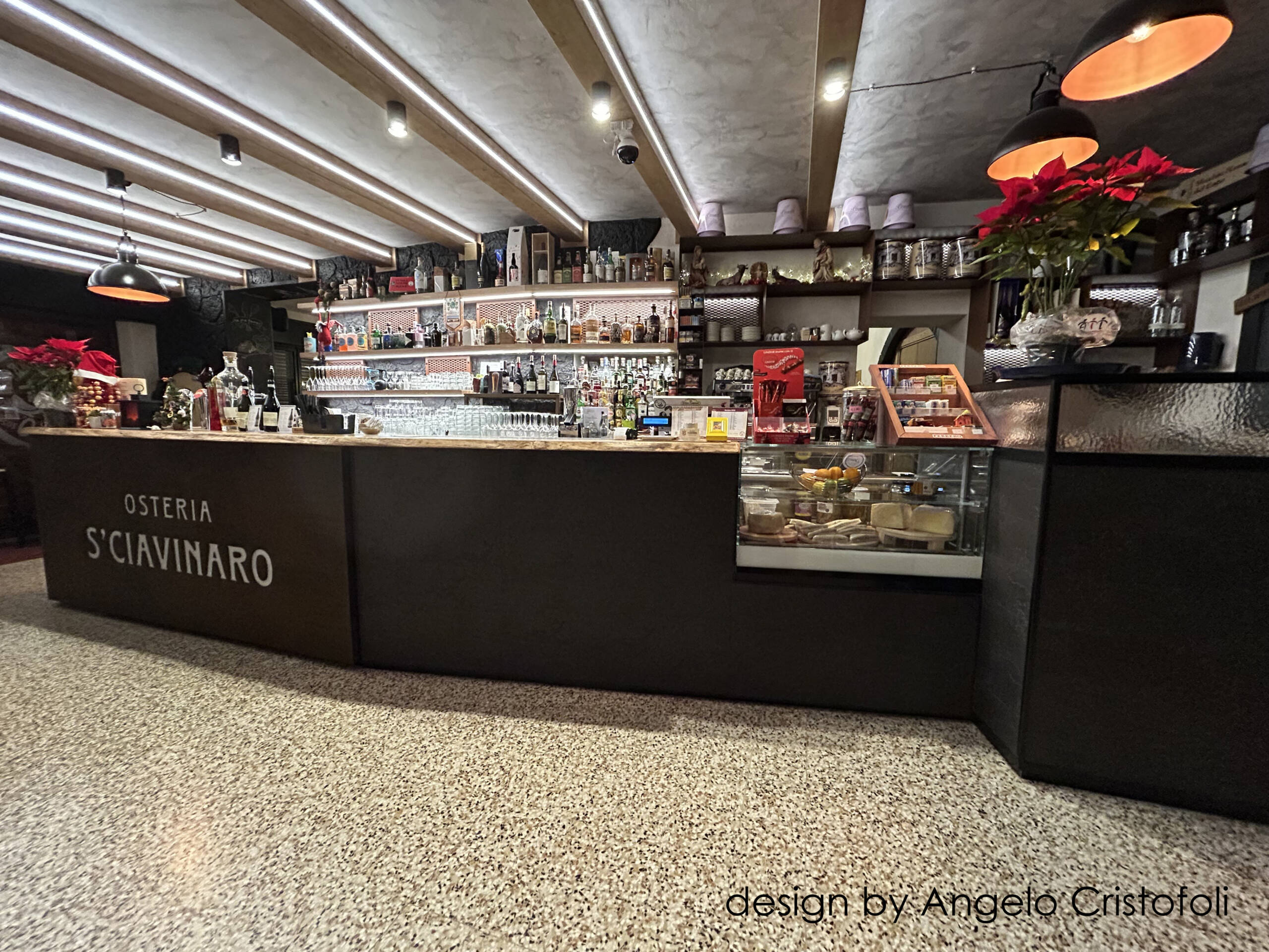Il nuovo arredamento del locale/osteria è stato progettato in collaborazione con Angelo Cristofoli, con particolare attenzione ai dettagli e alla funzionalità. Il banco bar è caratterizzato da un design innovativo, con una metà del fronte rivestita in metallo finitura Corten con logo traforato e retroilluminato, e l’altra metà con piastrelle artigianali dal design ricercato e bassorilievo geometrico.