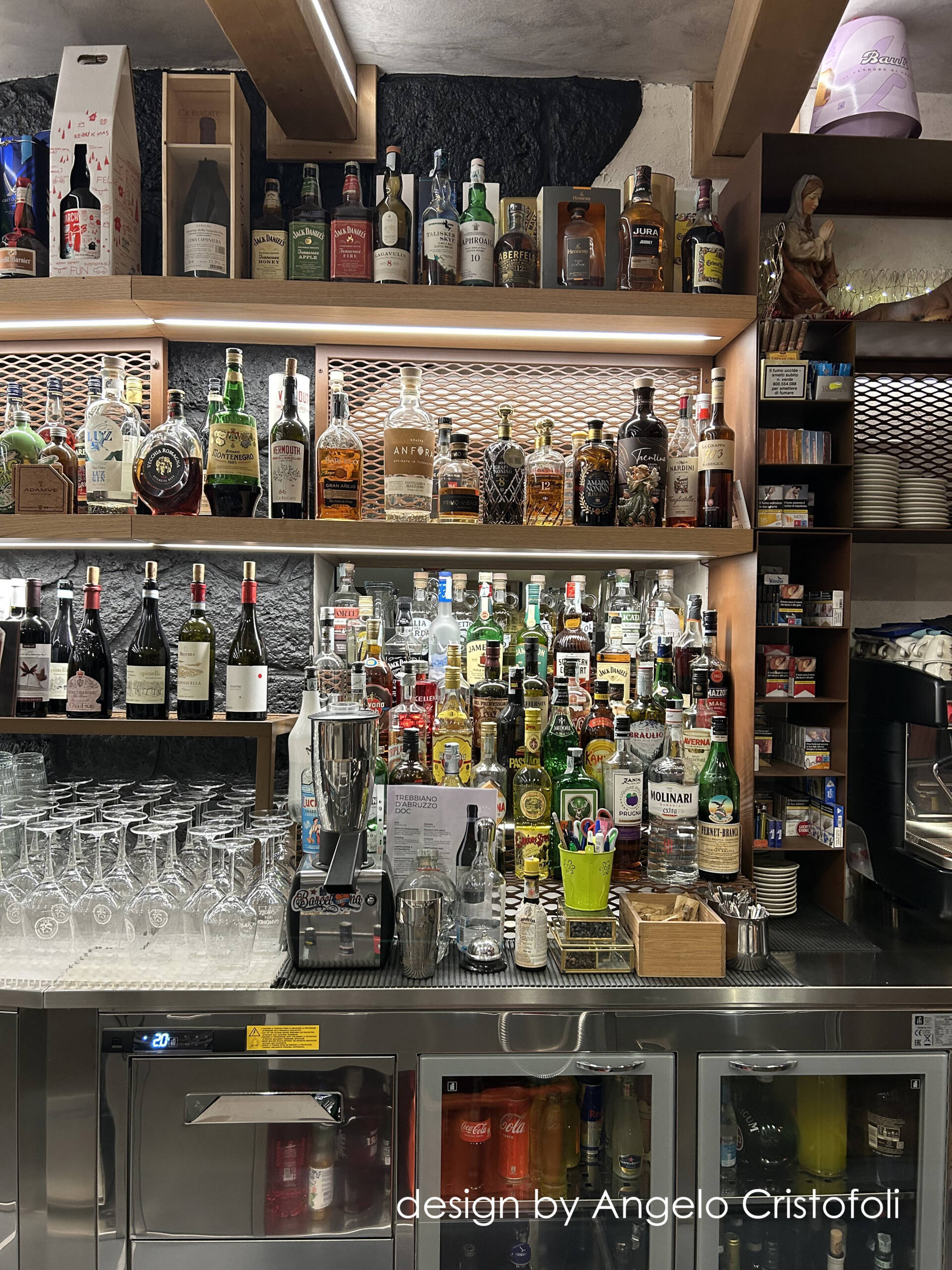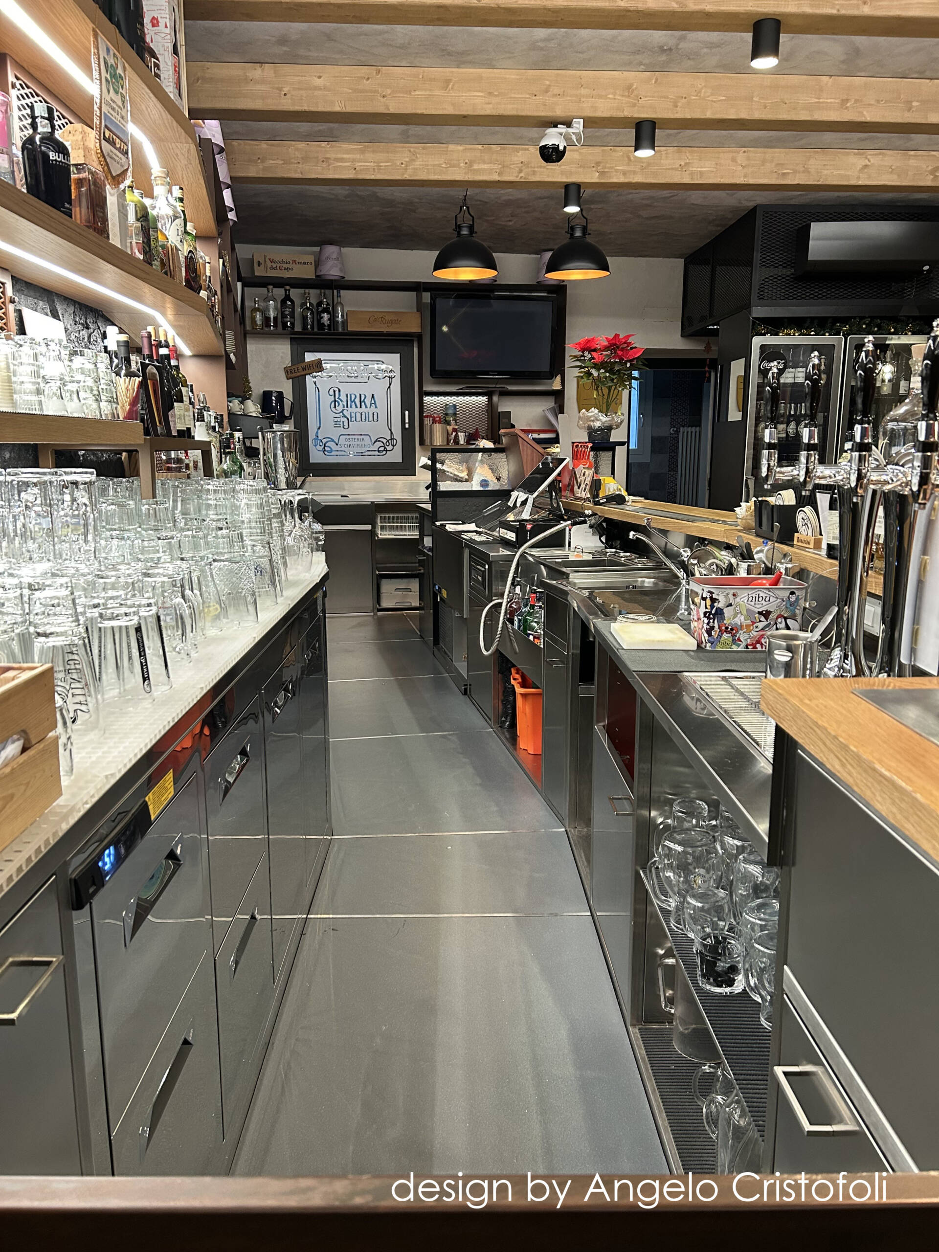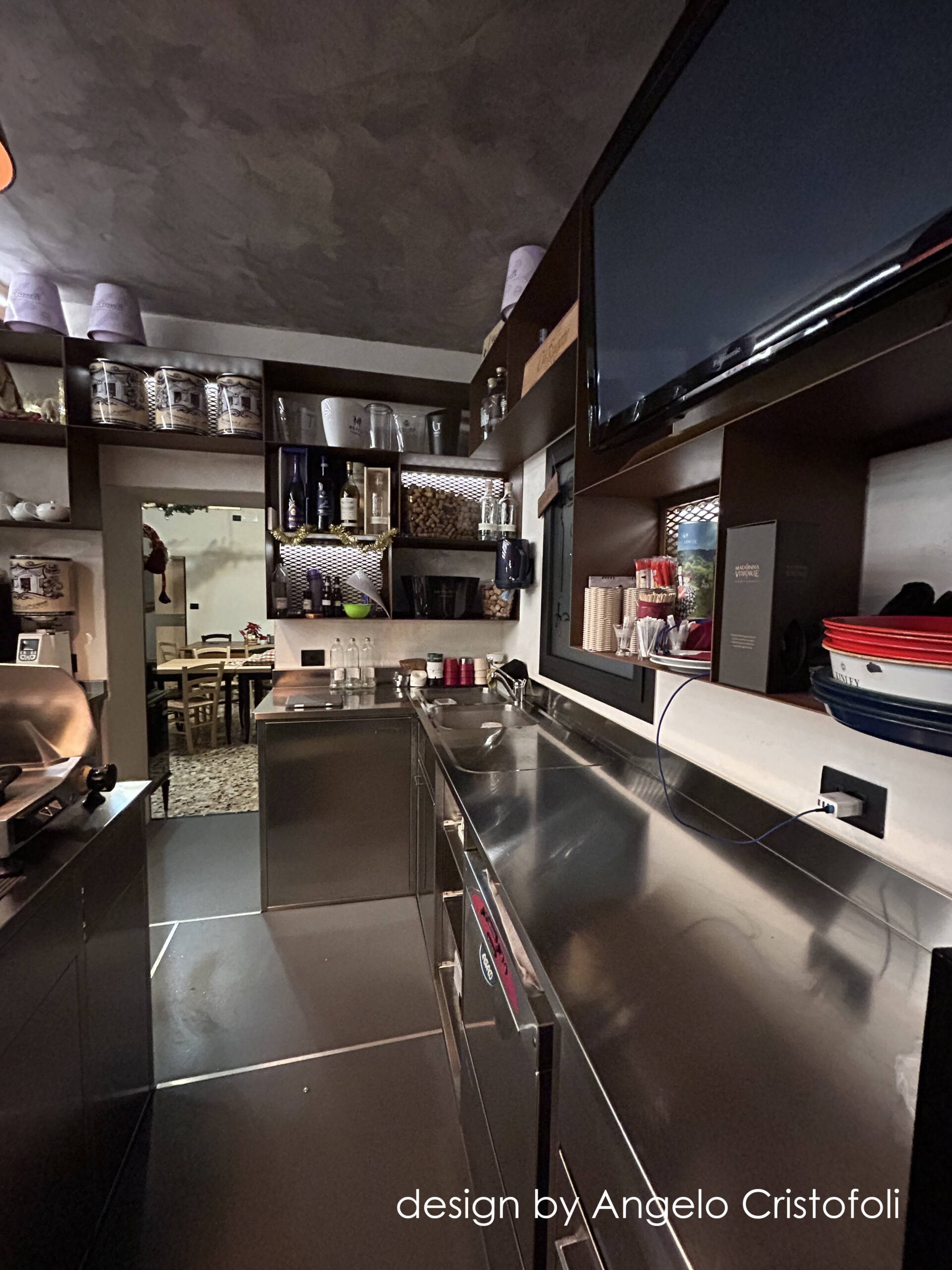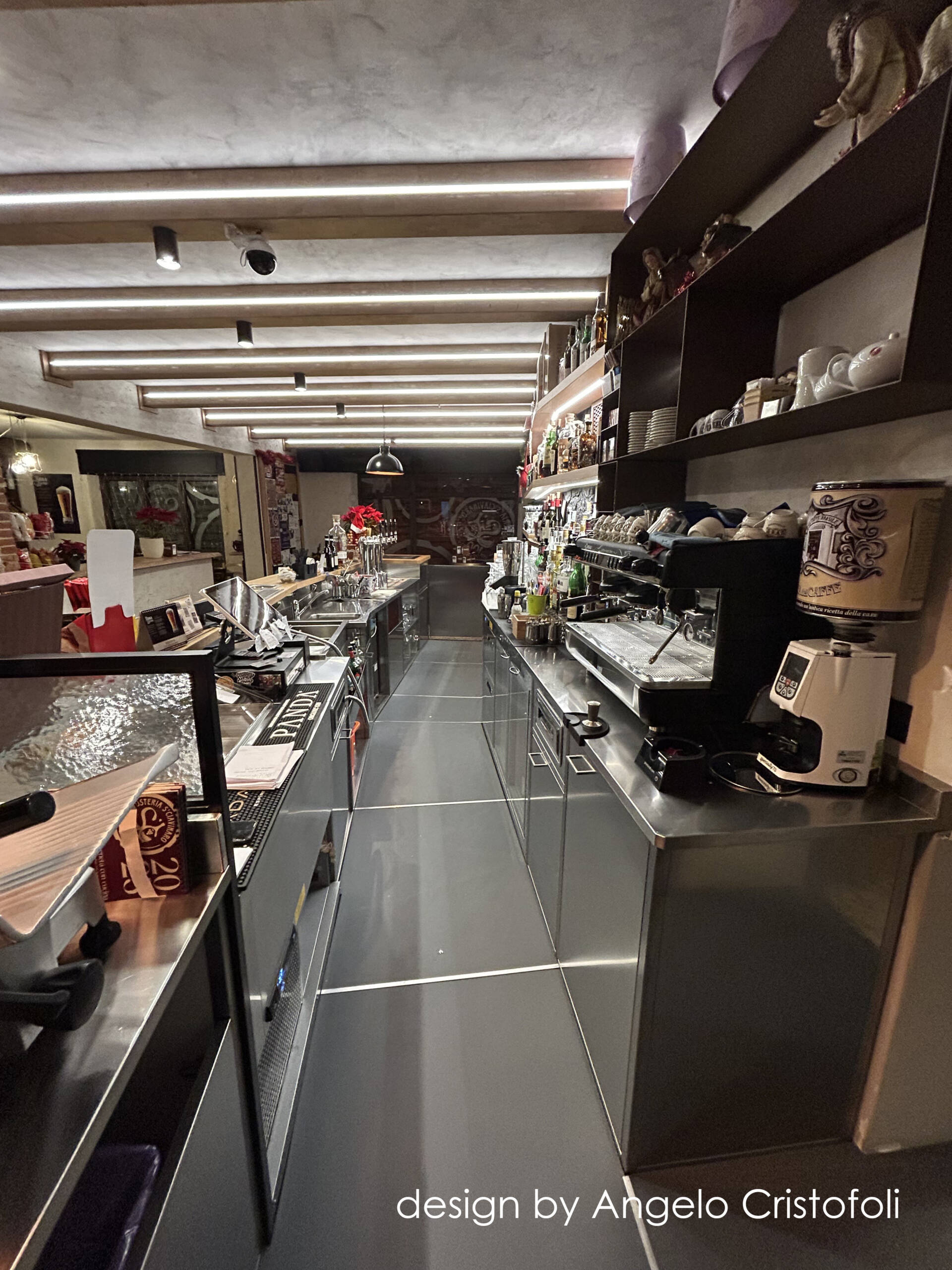 Il nuovo arredamento del locale/osteria è stato progettato in collaborazione con Angelo Cristofoli, con particolare attenzione ai dettagli e alla funzionalità. Il banco bar è caratterizzato da un design innovativo, con una metà del fronte rivestita in metallo finitura Corten con logo traforato e retroilluminato, e l’altra metà con piastrelle artigianali dal design ricercato e bassorilievo geometrico.