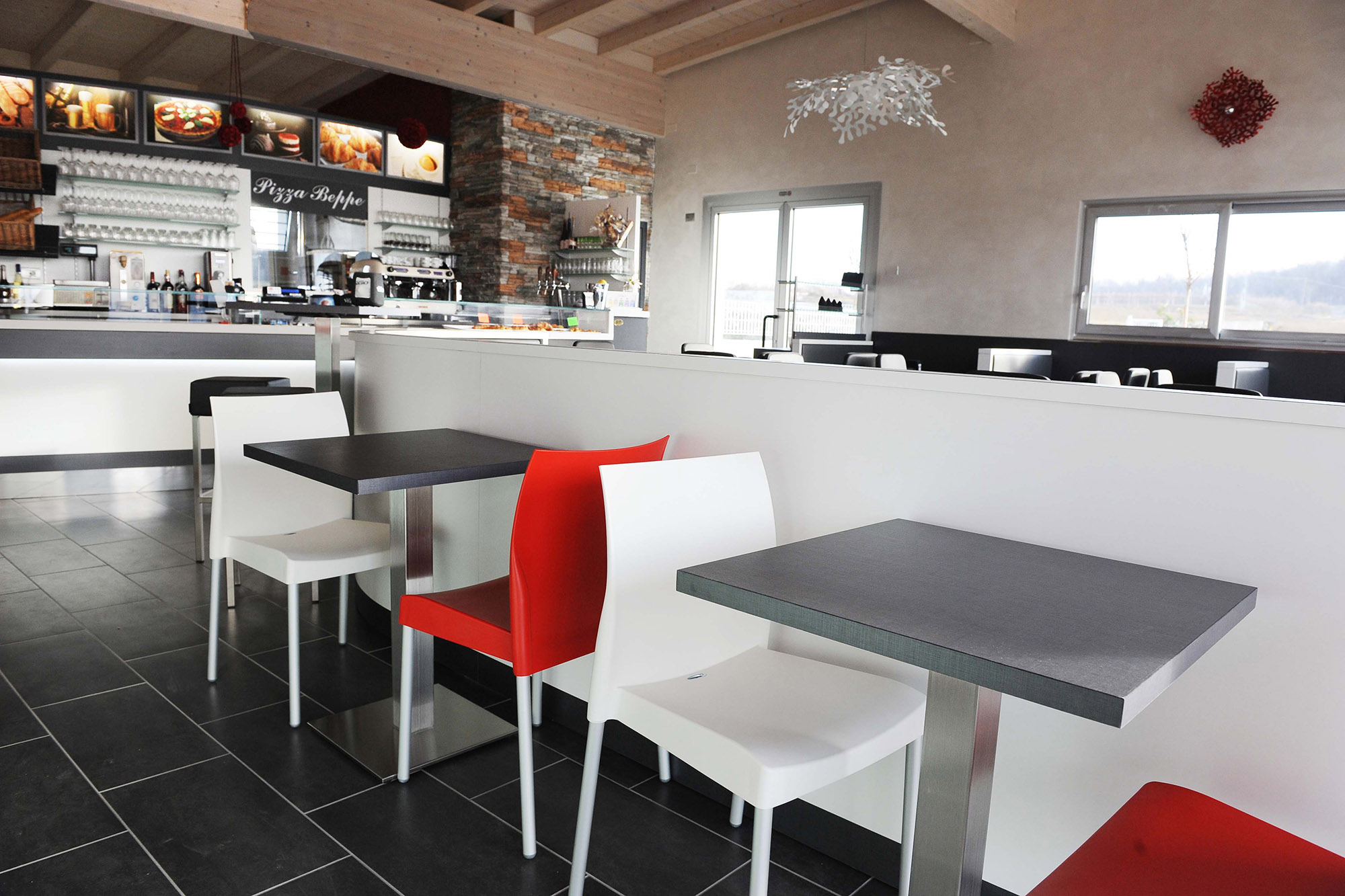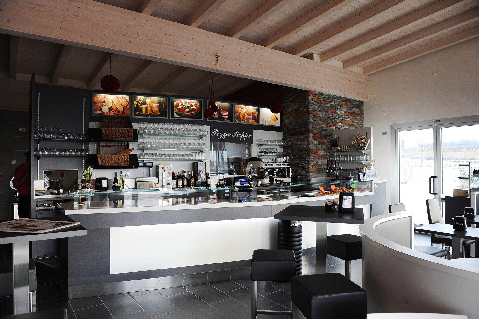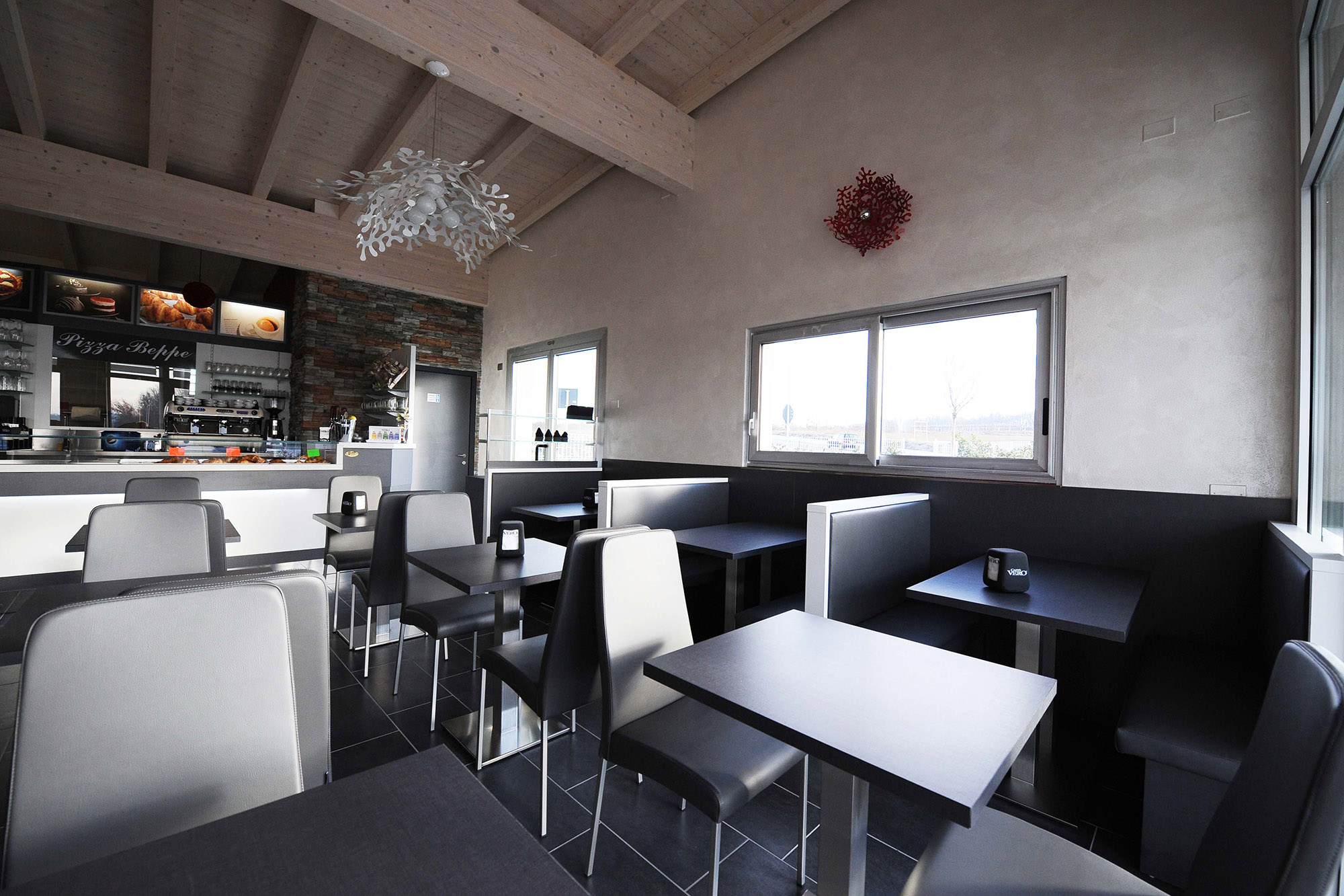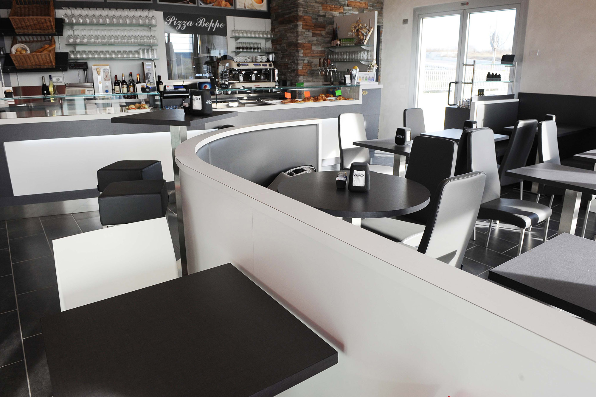 La sala da pranzo, progettata da GM Arredamenti, è caratterizzata da tavolini dal ripiano in legno nero, accostati a sedie e panche dai toni del grigio, creando un’atmosfera elegante e accogliente. Il bancone è un altro elemento distintivo, con un design contemporaneo, realizzato con pannelli bianchi bordati di grigio antracite, che dona un tocco di raffinatezza e modernità all’ambiente.