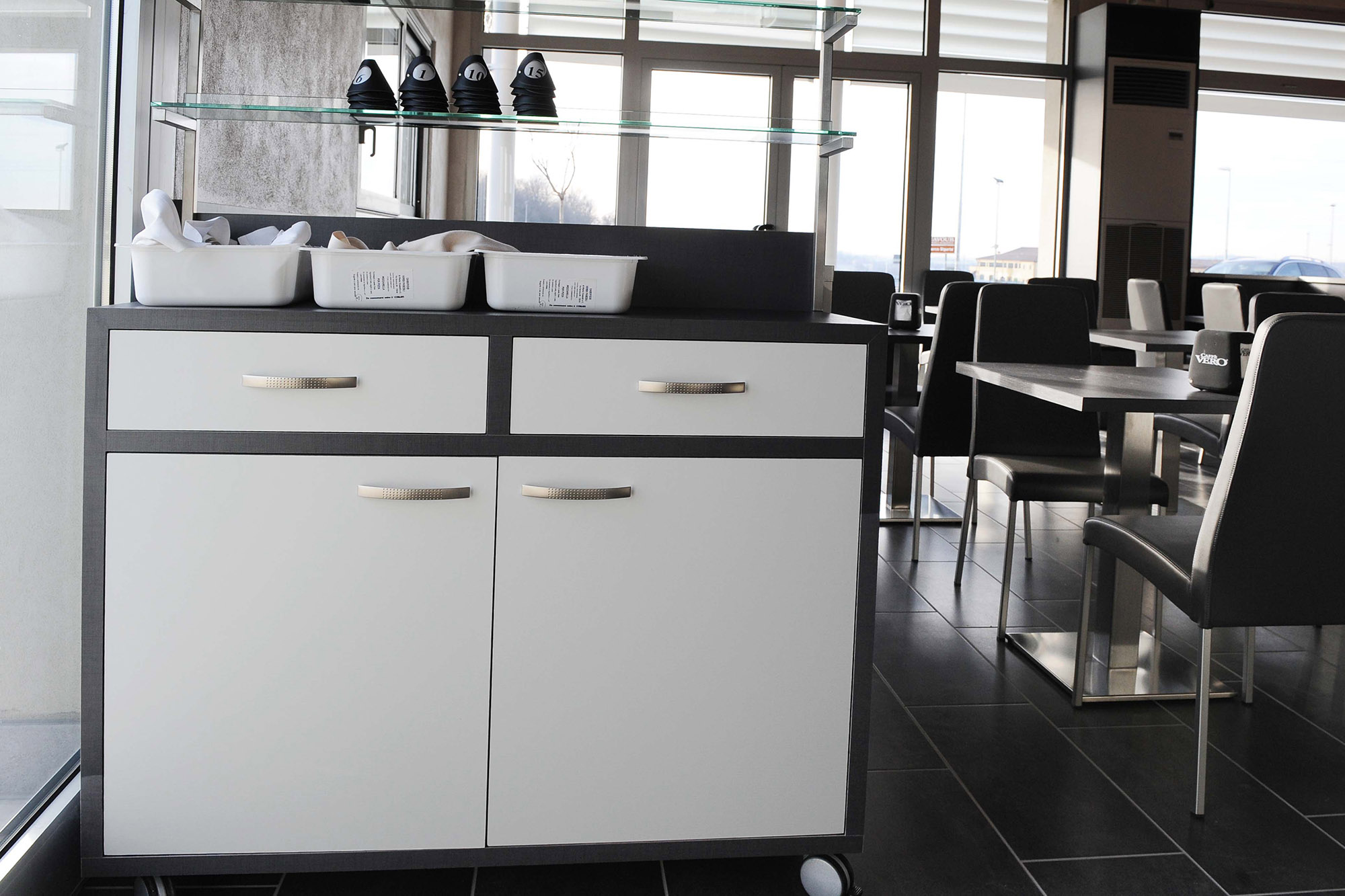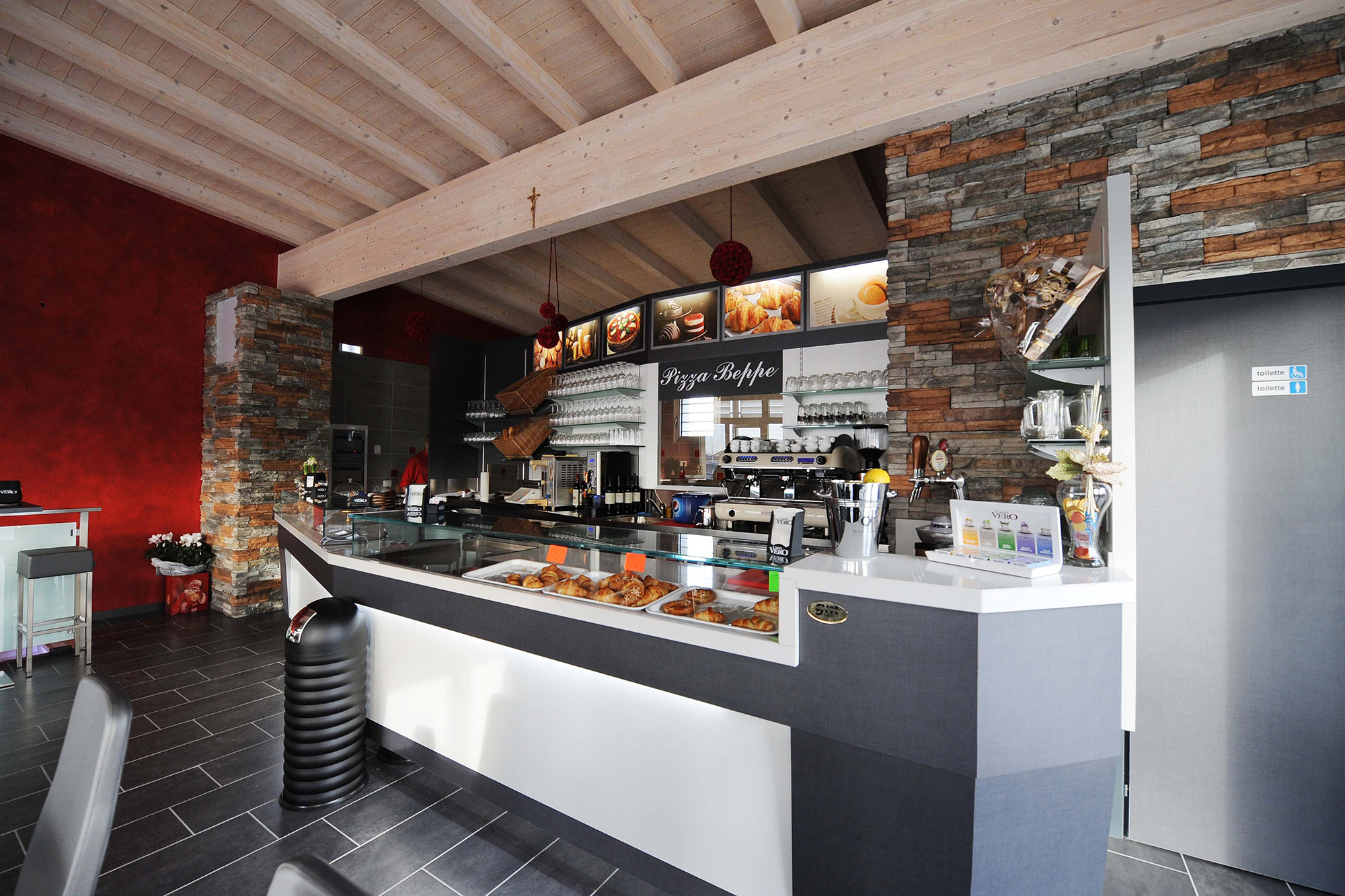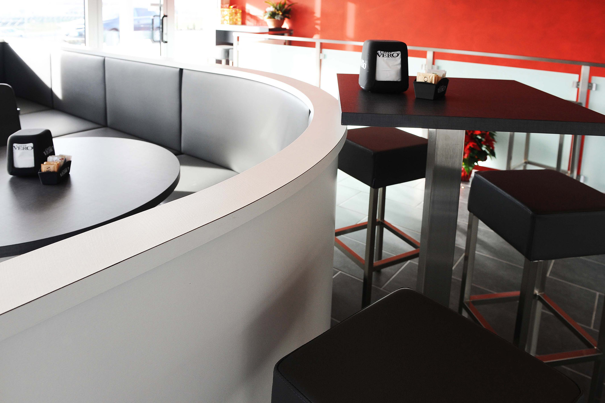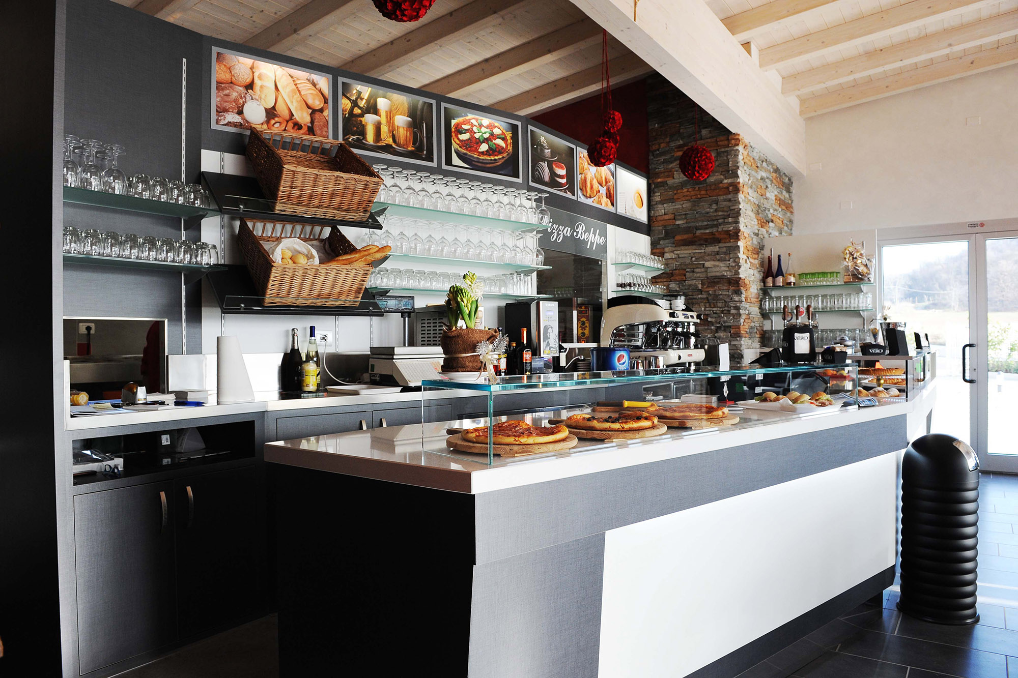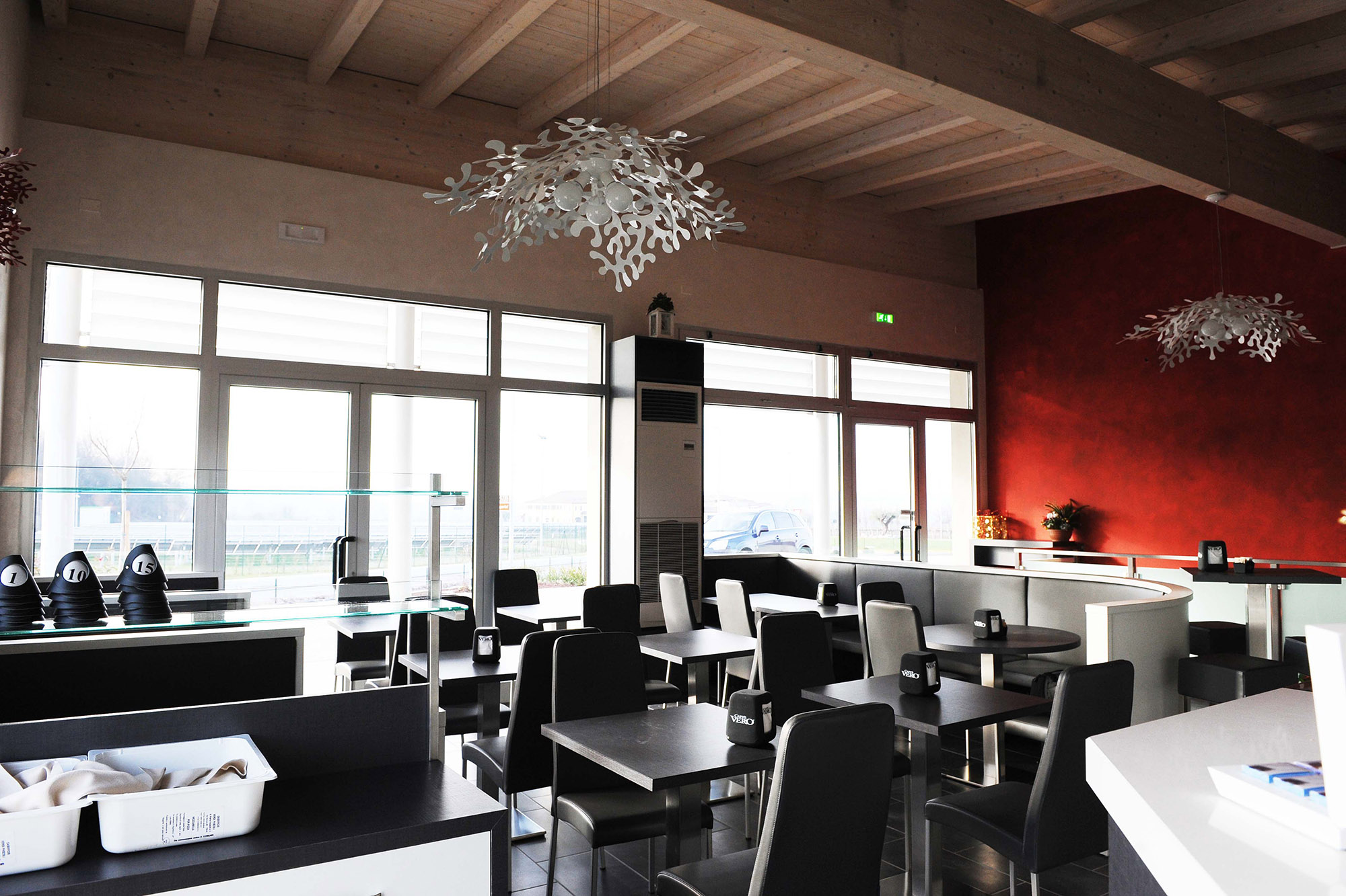 La sala da pranzo, progettata da GM Arredamenti, è caratterizzata da tavolini dal ripiano in legno nero, accostati a sedie e panche dai toni del grigio, creando un’atmosfera elegante e accogliente. Il bancone è un altro elemento distintivo, con un design contemporaneo, realizzato con pannelli bianchi bordati di grigio antracite, che dona un tocco di raffinatezza e modernità all’ambiente.
