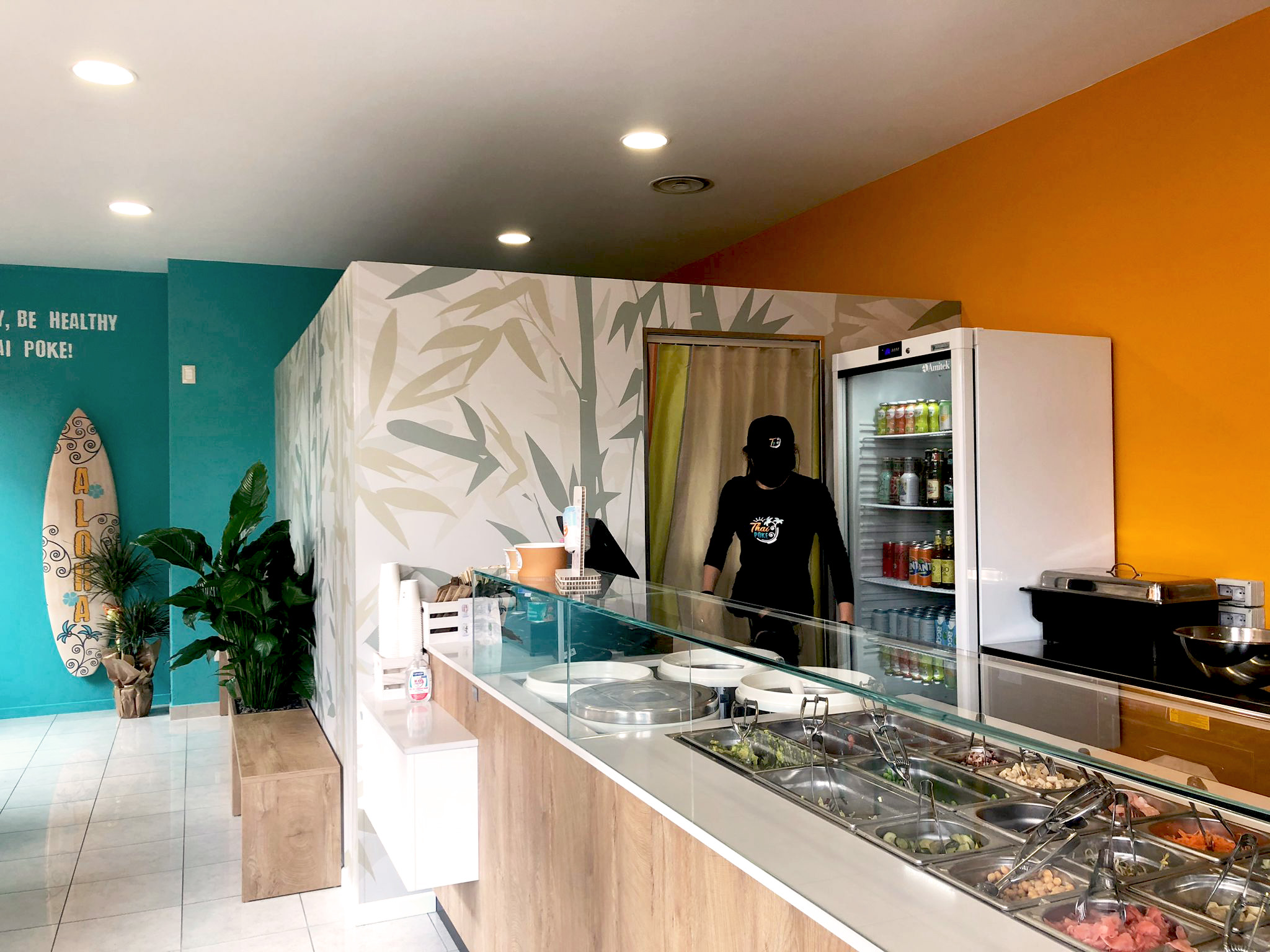 Progettazione e realizzazione arredo per Thai Poke a San Bonifacio (VR) da parte di GM Arredamenti. Soluzione su misura con colori vivaci, bancone in legno chiaro, e dettagli esotici.
