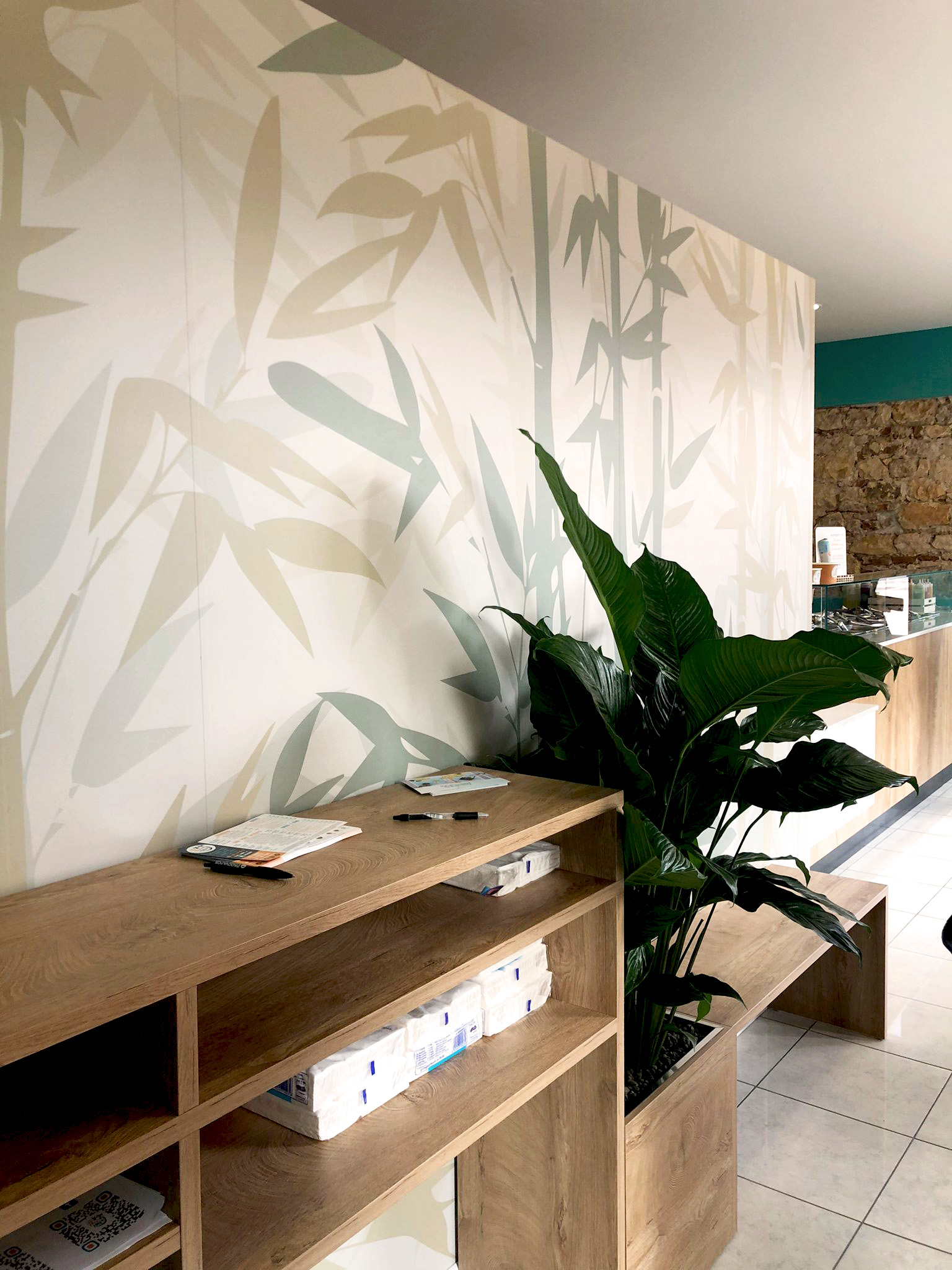 Il pezzo forte dell’arredo è il bancone con un grande vetro espositore per i prodotti freschi, realizzato in legno chiaro, che contribuisce a creare un’atmosfera luminosa e accogliente. Diversi ripiani, tavolini e sgabelli in legno chiaro completano l’arredo, offrendo agli avventori un luogo comodo e piacevole dove gustare le loro poke bowl appena preparate.